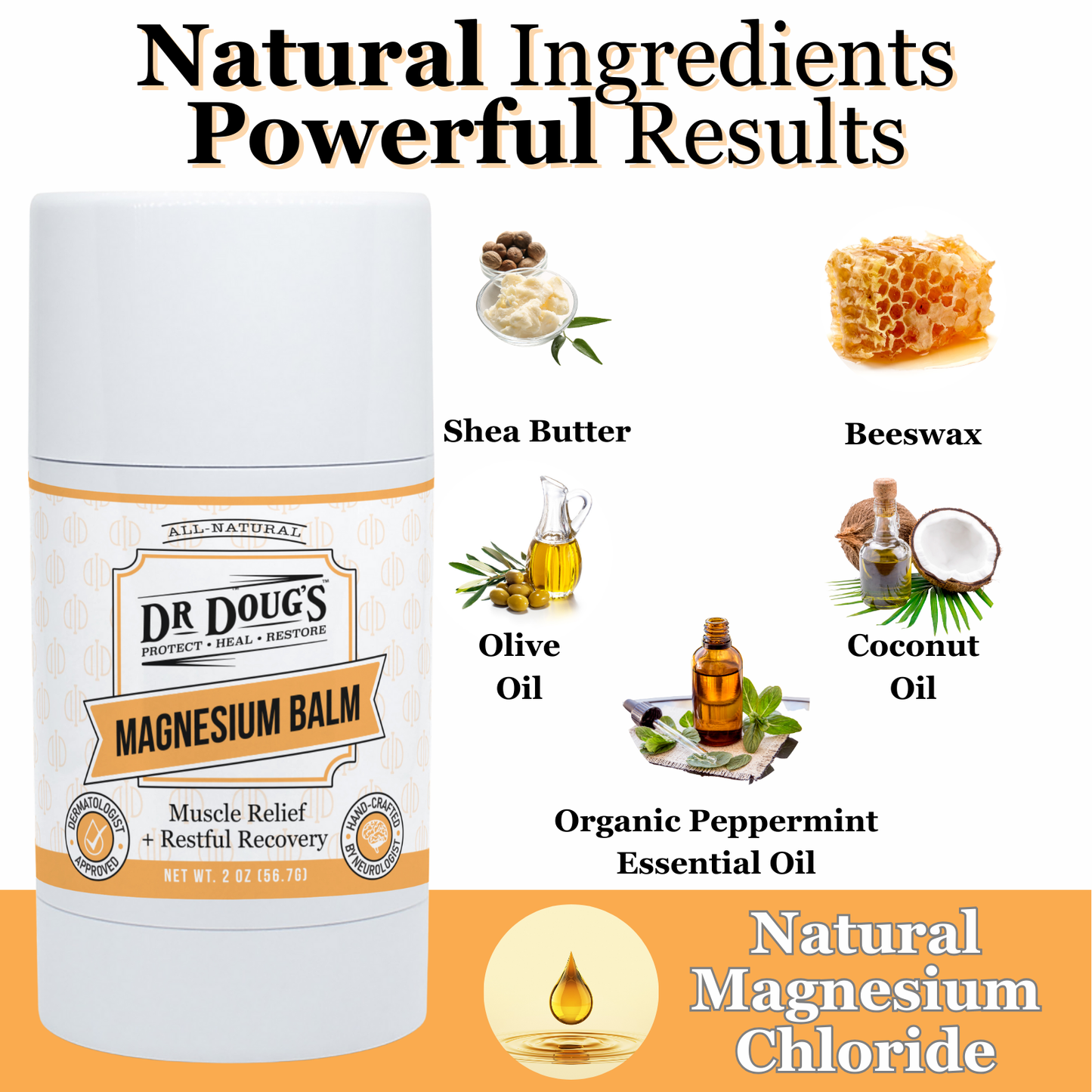 Your all-purpose, all-over skin hydrator. This is the balm that put Dr. Doug’s on the map: an all-natural, non-irritating formula that delivers long-lasting moisture from shower to shower. Perfect for dry, cracked heels, itchy shins, rough elbows, hands that live in soap or sanitizer, and eczema-prone skin that needs gentle, steady care. - Magnesium Balm – 2oz Twist-Up (On-the-Go Relief)